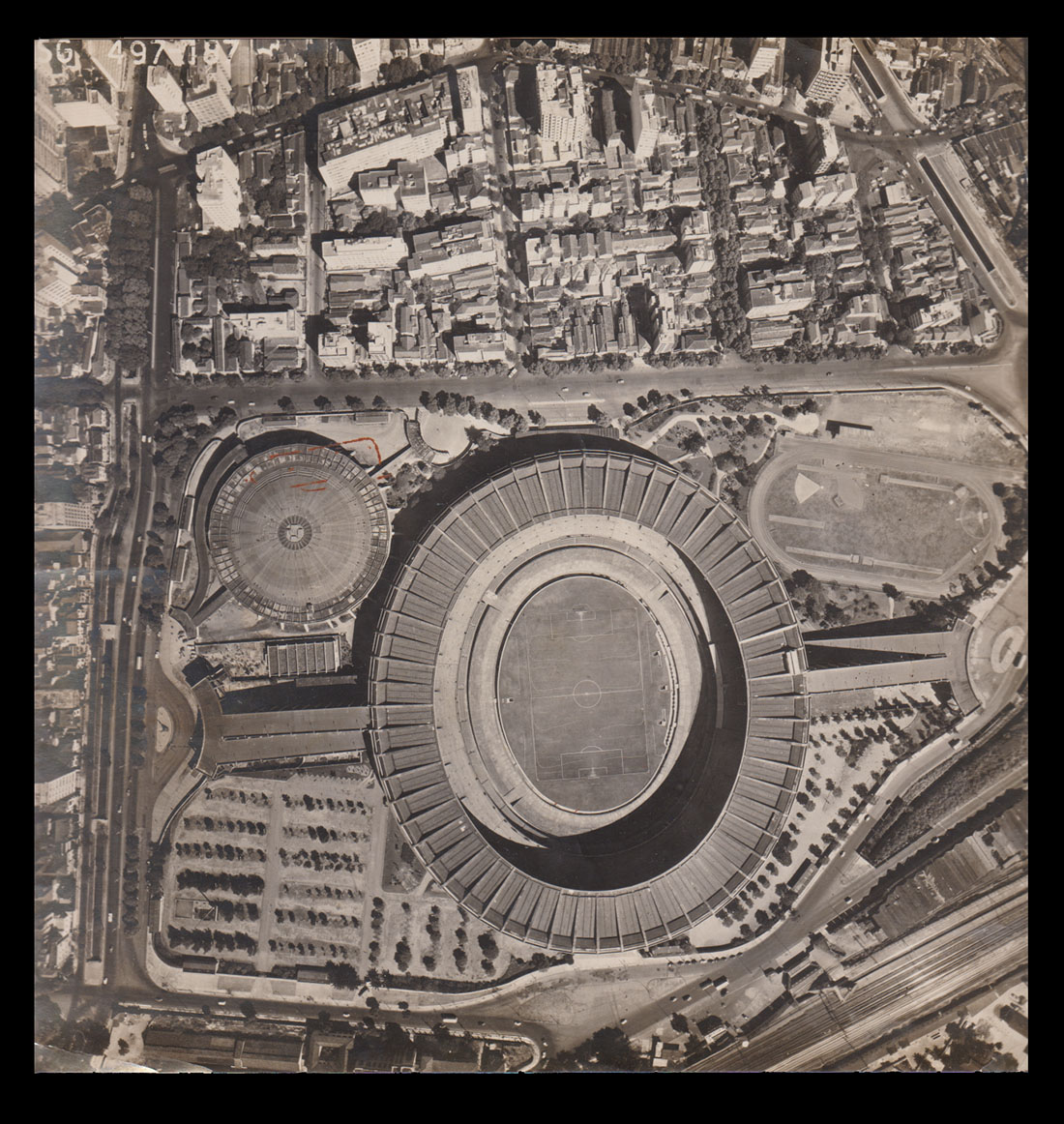 Fotografia aérea do futuro Complexo Desportivo Educacional do Maracanã, contendo o Estádio Municipal Mendes de Moraes (homenagem ao prefeito da cidade na época, mas sendo substituído em seguida para Estádio Municipal do Maracanã, e desde 1966 renomeado para Estádio Jornalista Mario Filho) e o Ginásio Gilberto Cardoso, o Maracanãzinho, inaugurado em 1954.